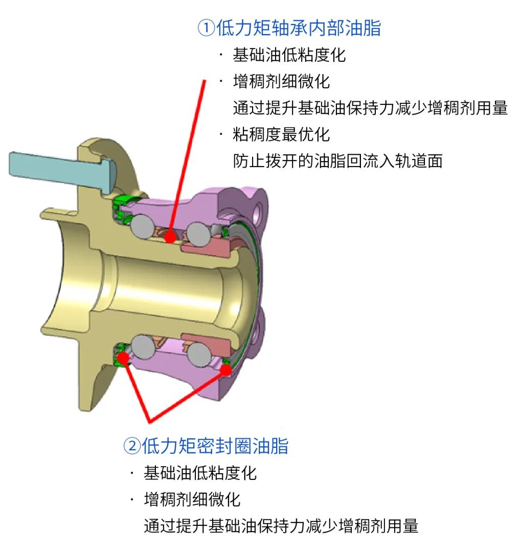 通過增稠劑尺寸的微細化,在不降低基礎(chǔ)油的保持力的情況下成功地削減了增稠劑量,進一步實現(xiàn)了潤滑脂的低粘度化。這些改進減少了密封圈旋轉(zhuǎn)時由油脂引起的阻力,并降低了行駛時的旋轉(zhuǎn)摩擦力矩。