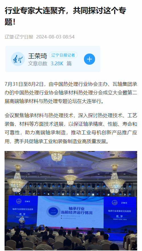 7月31日至8月2日,由中國熱處理行業(yè)協(xié)會(huì)主辦、瓦軸集團(tuán)承辦的中國熱處理行業(yè)協(xié)會(huì)軸承材料熱處理分會(huì)成立大會(huì)暨第二屆高端軸承材料與熱處理專題論壇在大連香格里拉酒店舉行。會(huì)議聚焦軸承材料與熱處理技術(shù),深入探討熱處理技術(shù)、工藝裝備、材料等方面技術(shù)進(jìn)展,助力高端軸承制造,推動(dòng)工業(yè)母機(jī)創(chuàng)新產(chǎn)品推廣應(yīng)用,攜手共促軸承工業(yè)和裝備制造業(yè)高質(zhì)量發(fā)展。來自國內(nèi)外軸承材料及熱處理相關(guān)單位技術(shù)人員、行業(yè)專家近300人參加會(huì)議。