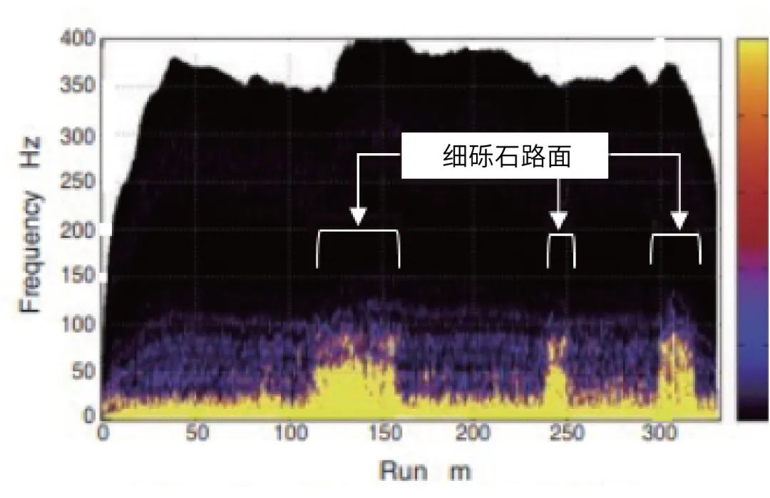 車輪旋轉(zhuǎn)信號包括輪胎狀況(氣壓等)和路面狀況的影響。通過分析高分辨率的旋轉(zhuǎn)信號,我們可以更準確地檢測輪胎狀況和路面狀況的差異。例如,當經(jīng)過一段礫石覆蓋的瀝青路時,轉(zhuǎn)速變動頻譜如圖3所示。使用這種高分辨率信號可以進一步增強汽車控制的功能。