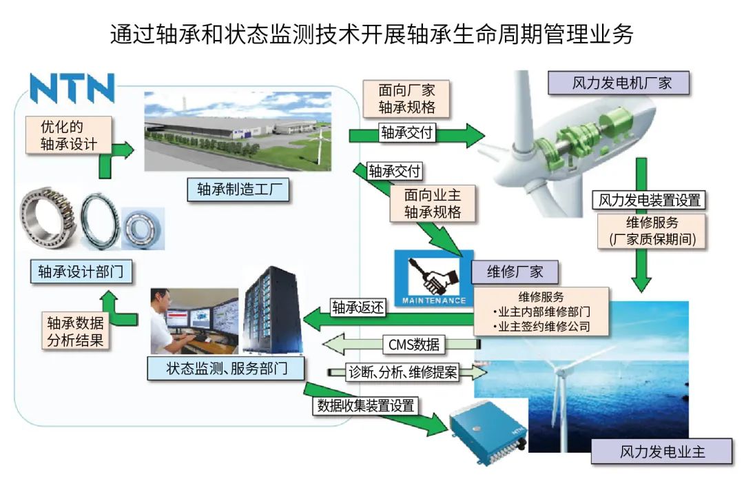 在風力發(fā)電領(lǐng)域,NTN與Hokutaku有限公司合作,啟動了維護業(yè)務。通過基于CMS信息優(yōu)化風力發(fā)電設(shè)備的運行和維護(智能維護),并在軸承開發(fā)和采購以及運行和維護服務方面進行合作,如圖14所示,開展軸承生命周期管理業(yè)務,努力貢獻于社會。